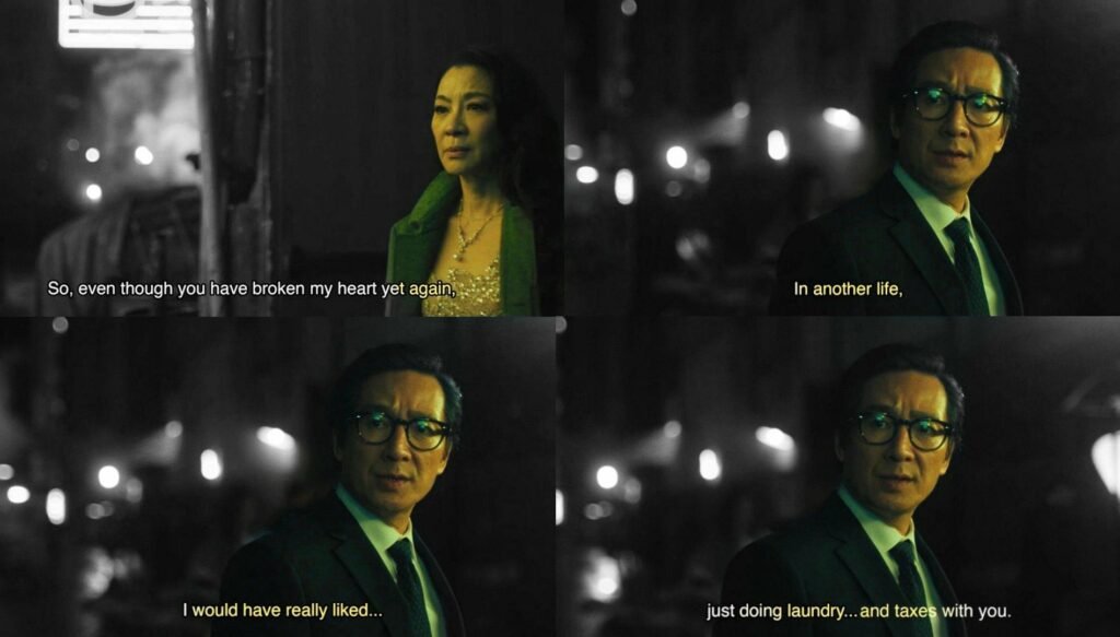 What’s really cool about Evelyn and Joy making amends with each other is that while each of the other scenes involving Evelyn making amends with her family took place across universes, in this case, since Joy is Jobu Tupaki and unstuck from the multiverse, every universe they interact in is relevant to their situation. Literally everything is happening everywhere, all at once in the case of these two characters putting aside their differences. It also gives their connection much more of a dramatic weight and helps us as the audience feel for them all the more.