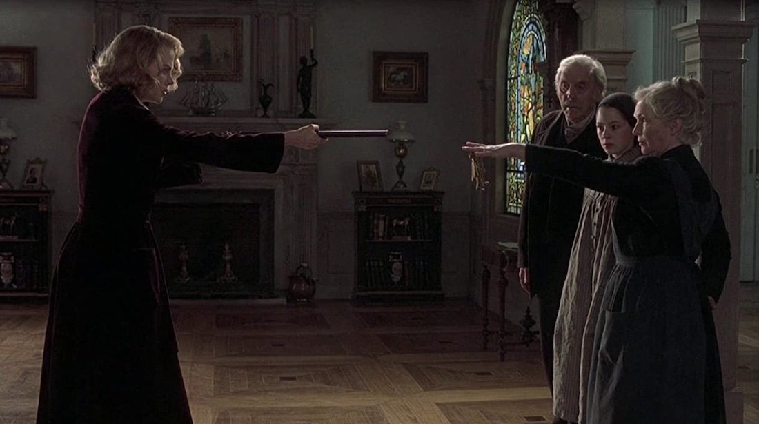 Things only seem to get worse and worse in regards to the paranormal happenings in the house because the family wakes up soon after Charles leaves to find that all of the curtains in the house have been taken down. Since you may remember the children are incredibly photosensitive, they end up freaking out and sounding the alarm to the three housekeepers. Mrs. Mills, Mr. Tuttle, and Lydia however don’t seem startled by this revelation however, almost as if they knew this was something that would happen at some point or another, and they try to talk Grace down from a freak out. This doesn’t work though and only causes Grace to grab the in-house shotgun and threaten the housekeepers to hand over the keys to the palace or else. Eventually they leave which is when the climax officially starts and everything falls into place.