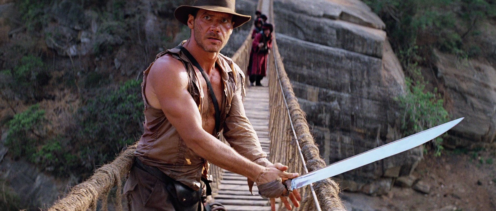 With their enemies dispatched at the end of the tunnel they have to slow down, but the brake breaks. Indy then stops the cart manually but sets his shoes on fire in the process. Lucky for him there’s a bunch of water flooding their way courtesy of Mola Ram and the rest of the Thuggee. They escape it when they probably shouldn’t and climb up a cliffside where they find the climax of the movie. Not before a clever callback to the first movie though where Indy is briefly cornered by two Thuggee members with swords. He goes to shoot them but he doesn’t have his gun, so he just smiles and laughs. I legit laugh every time I see that. Back at the climax, Willie and Short Round run into Mola Ram and a swath of Thuggee members on a bridge where they get cornered and threatened to give up the stones that Indy has when he follows them to the same bridge. Indy, of course, refuses causing the Thuggee to close in on him from both sides of the bridge and Indy gets the brilliant idea to destroy the bridge with everyone on it.