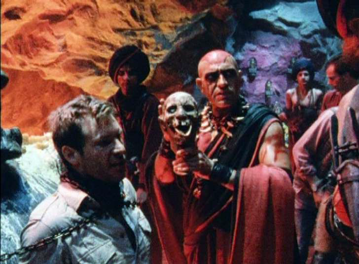 Once the area clears out, Dr. Jones descends into the main chamber to retrieve the Sankara Stones the Thuggees irresponsibly left behind unattended, leaving Willie and Short Round a chance to get captured while he’s not paying attention. The reason he’s not paying attention is because he found where the child slaves are being kept. I should also mention that it’s kinda dumb to capture the village children to be your slave labor when you could’ve just picked able-bodied adults instead. Maybe Kali isn’t big on logic. By seeing this, Dr. Jones gets so angry he lobs a rock at the Slave Driver (played by Pat Roach in brownface (this movie is so progressive, y’all)) which causes him to be discovered and captured. What was your plan there Indiana? So Mola Ram gives him a talking to about Thuggee history and their relationship with the Sankara Stones, and personally I think this could’ve been a great opportunity to go in-depth and complex with his character and motivation for being evil. However, like most things in this movie, it’s completely wasted.