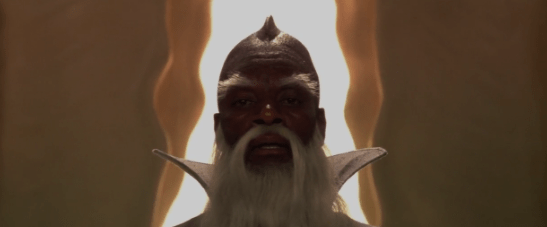 I also really love the design of these characters including the Rock Biter himself, Teeny Weeny’s Racing Snail, and Night Hob’s Stupid Bat. While they may not be the most realistic per say (I mean heck, Rock Biter’s lips rarely, if ever, match up with what he actually says), they do still look distinct from each other and clearly have a unique style that makes it easy to believe that they all come from different parts of the same world. After the Rock Biter shows off the reason he’s called ‘Rock Biter’, he explains why he’s here which introduces us to the concept of the Nothing. As it turns out in Fantasia there’s an entity that’s appeared which destroys/absorbs/erases everything it comes into contact with leaving nothing in its place. Literally nothing. Hence the name: the Nothing. Everyone at the campsite has been called to the home of Fantasia’s Empress, the Ivory Tower (I’ll also say it’s kinda funny that the center of this world’s government is literally called the Ivory Tower), who is supposed to have the solution to this issue. Upon making it there, the Empress’ assistant Cairon (played by Moses Gunn) explains that the Empress is dying since her life force seems to be tied to Fantasia itself that the Nothing is now destroying. Their only chance now is a hero named Atreyu.