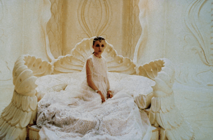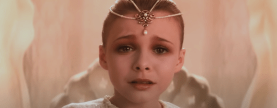 Either way, as the last parts of Fantasia start to crumble around Atreyu, Falkor luckily swoops to his rescue with the Auryn gripped tightly in his teeth. At this point all the land that made up this wonderful world is completely gone and no one else is living in it. That is until the Auryn guides Atreyu and Falkor back to the Ivory Tower which just so happens to still be standing amidst the broken landeroids (that’s land-asteroid). After landing at the top of the tower, Atreyu enters the Empress’ chamber (she’s played by Tami Stronach in her first role) where she’s still sitting looking like she hasn’t been sick at all. Frickin’ faker. I will give props to the costume designers though because her outfit to me is instantly iconic.
