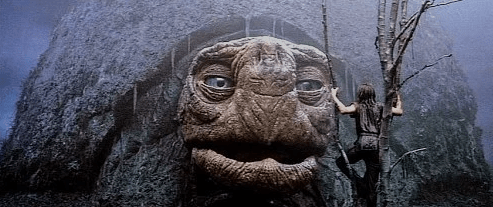 Being separated from Falkor, no one else around, and the death of his greatest companion Artax still weighing on him, Atreyu begins to wander aimlessly throughout the island until he comes across the Rock Biter. Get your tissues ready, because this scene gets me every time. The Rock Biter is lamenting the loss of his friends: Teeny Weeny, Night Hob, the Racing Snail, and the Stupid Bat since he tried to keep the Nothing from taking them away from him by holding onto them as tightly as he could, but he just couldn’t do it. The Nothing was too strong and it blew them away from him so now he’s resigned himself to sitting in this one place until the Nothing takes him away too as he blames himself for not being strong enough. For a kid’s movie, this film also has an impressive body count since each of these cute characters we come across eventually end up dying at the hands of the Nothing. That and also this is a particularly adult moment dealing with complex emotions and survivor’s remorse. If you’re not crying right now the Rock Biter will do it for you.
