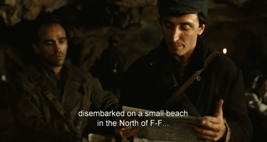 Meanwhile, Captain Vidal is called to deal with two people who were caught nearby the outpost. They claim to be father and son, farmers who were just out hunting wabbits in the area, but Captain Vidal doesn’t like their tone. Especially the son’s, whom he brutalizes with a bottle before shooting both of them dead. This scene is easily the most graphically violent in the movie and as the film progresses the violence only gets more and more downplayed to emphasize how meaningless the soldiers’ fight really is. Also, this scene was based on an oral account of a true event that happened shortly after the Spanish Civil War where a fascist soldier ended up killing two innocent civilians, one by bashing their nose in with the butt of his gun. I say this because in the movie, of course the Captain only searches the rest of the farmers’ belongings after he killed them to see that they were in fact telling the truth, making their deaths that much more cruel and meaningless much like the real life heartless killings. I won’t give you a .gif of that because I cringe up whenever I see it myself, you’ll just have to watch the movie to see it in all its bloody glory.