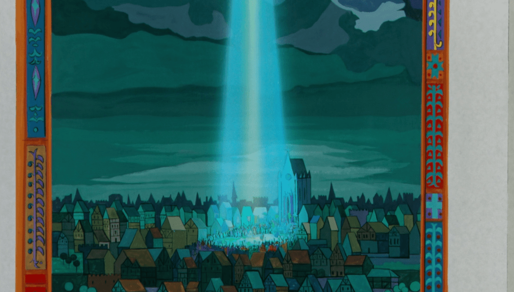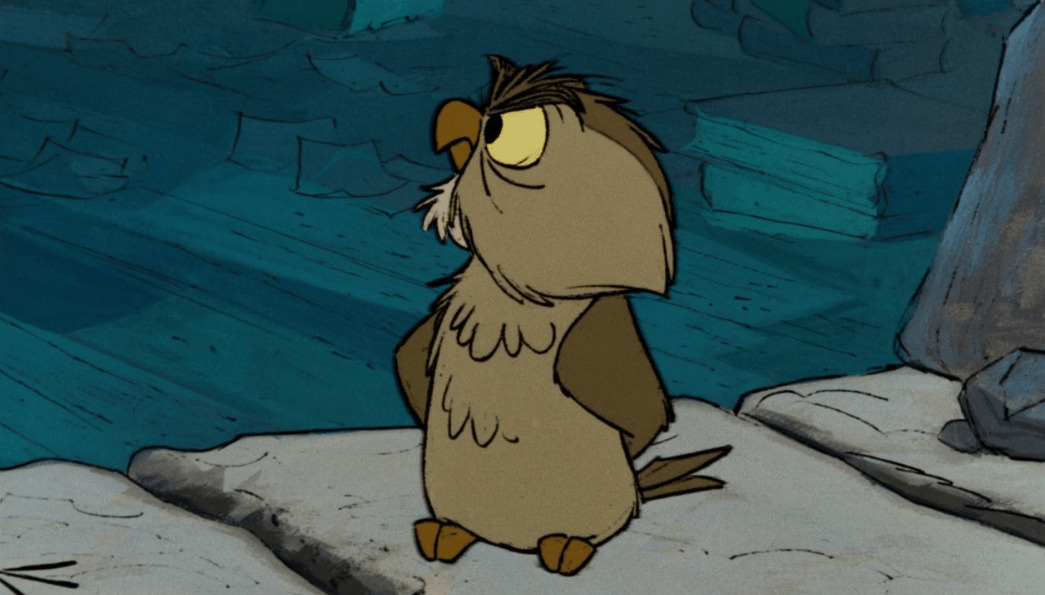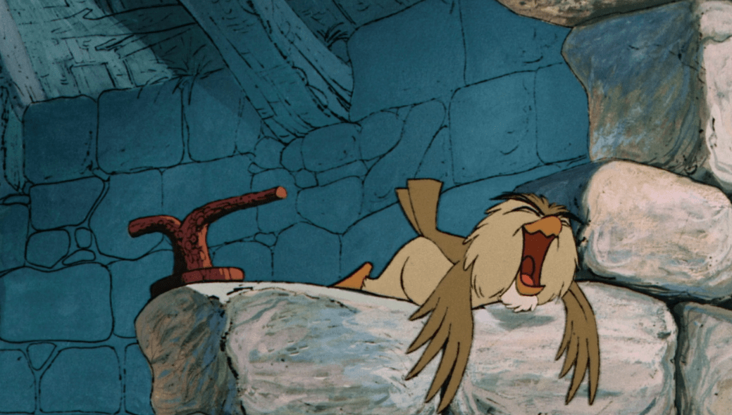 So now the task for Ector is to train Kay up to become a knight so he can be in the tournament and hopefully become the king. He also picks Arthur to be Kay’s squire. With this knowledge in tow, Archimedes makes his way back up to the tower to let Merlin know. One thing I never quite understood though is that while Archimedes is flying up to the tower, the orchestra plays this really suspenseful tune. Why? What’s so tense about this moment? I guess there’s a bit of tension knowing that whoever wins the tournament will be crowned king whether it’s Kay or not, especially since historically Arthur is supposed to become king, but it still seems like a bit of an odd choice to me.