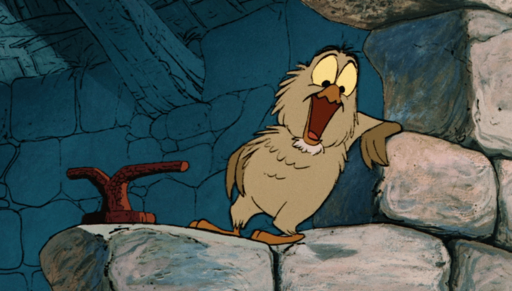 Being a squirrel she doesn’t talk (though her chittering is played by Ginny Tyler) and like I said, she’s frickin’ hilarious. As soon as she sets eyes on Arthur, she instantly falls in love with him and does everything in her power to get with him. You know what I mean. Every step of the way, no matter how much Arthur protests, she never gets the message and constantly chases him. That and her chittering is so ridiculous, cute, and funny at the same time I wish that I could’ve seen Ginny Tyler record for this movie. If only. Anyway, Merlin’s third song “A Most Befuddling Thing” is pretty good too while also describing the concept of love to Arthur and the audience.