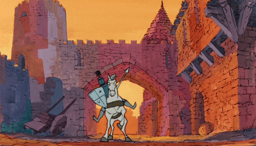 We get some more repeated animation and more wolf slapstick until Merlin realizes he’s leading Arthur in the wrong direction and they turn around. Again, this is probably something they could’ve cut out since it’s not particularly necessary, but not only does it play into Merlin’s character as being a bit absent-minded and somewhat senile, but the movie also has an interesting slice-of-life kind of feel to it. Sure scenes like this can drag things out, and I’m not gonna lie that can make things feel a bit more boring, but the movie is only 80 minutes already and if you prefer to watch for the sake of seeing these characters’ interactions, then I’m sure you won’t mind too much. For me, just seeing these characters talk with each other is fun and engaging on its own.