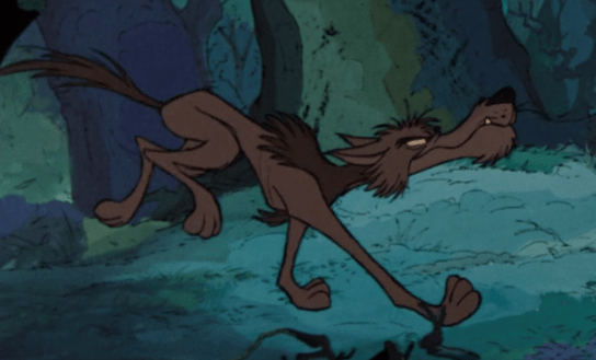 Soon after, we’re also introduced to Arthur’s jerky foster brother Kay (played by Norman Alden) who’s always animated like he’s an American doing a bad British accent. Believe me, once you see that you can never un-see it. He’s just outside Merlin and Archimedes’ forest doing a bit of hunting until Arthur messes him up. On the plus side, at least Arthur saved Bambi’s mom! Kay gets mad at him, but Arthur tries to make it up to him by promising to go into the woods himself and recover Kay’s lost arrow. It’s here we’re also introduced to this one wolf that’ll be a recurring character from here on.