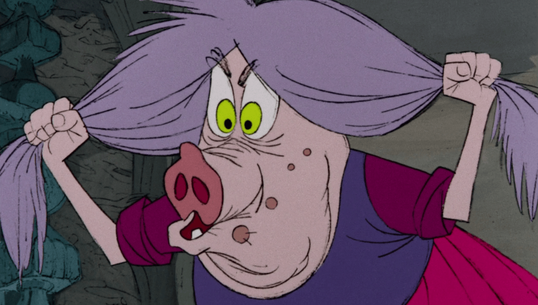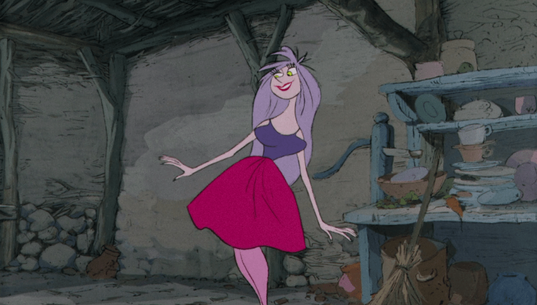 So Archimedes takes Arthur out on his first flying session, and it takes him a second to get the hang of it, but as soon as he does he starts making the real bird look bad. All this is eventually cut short when they notice the presence of a hawk flying above them. Another thing I like about each of these transformation sequences is that each of them has some form of predator that hunts the characters. I think in the end it gets across the idea that there’s always going to be someone out there who’s stronger than you, but you have the ability to outsmart them if you can. This chase eventually ends with Arthur falling down a chimney and us getting introduced to the closest thing this movie has to a villain: Madam Mim (played by Martha Wentworth).