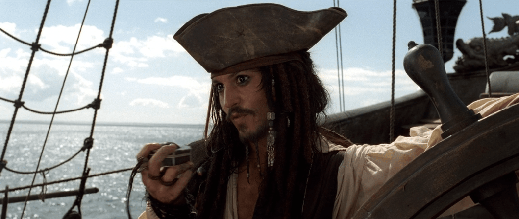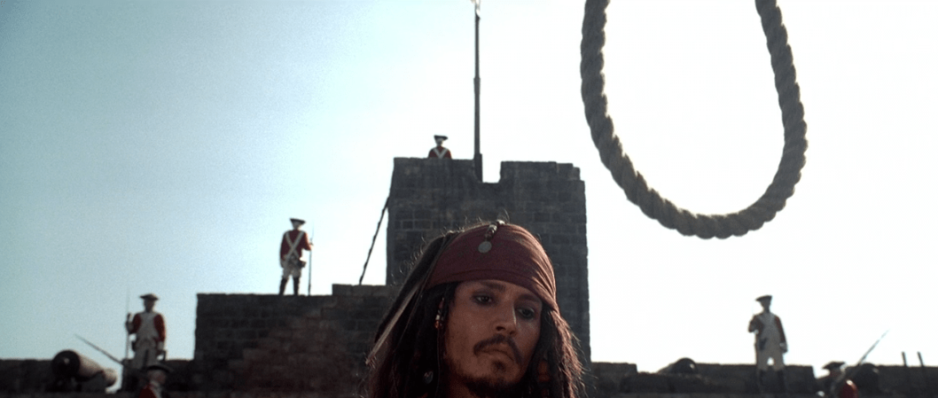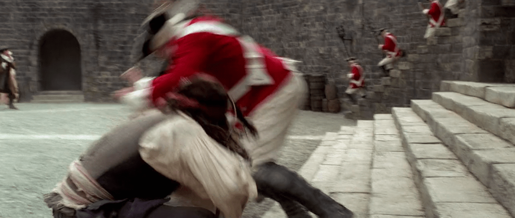 Jack manages to skate past Murtogg and Mullroy’s suspicions until a certain someone falls from the cliff above them into the water. That someone is Elizabeth because her new corset has restricted her breathing so much to the point she passed out. I guess this is before fainting couches were invented. Since the two men enlisted in the Navy can’t swim (it was a different time, okay?), Jack decides to dive in and rescue her. Not before the medallion Elizabeth stole from Will sends a shockwave through the water. Strange. After bringing her back to the docks, Jack is stopped by Governor Swann, Norrington, and the rest of the Navy reinforcements where we discover a few more things about Jack. He’s got a pistol with only one shot and a compass that doesn’t point north (until the sequels retcon that). Everyone’s favorite character Commodore Norrington goes to arrest Jack and hang him for piracy, but Jack instead manages to elude them in trademark Sparrow fashion.