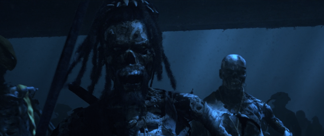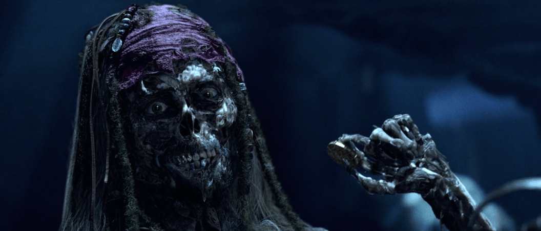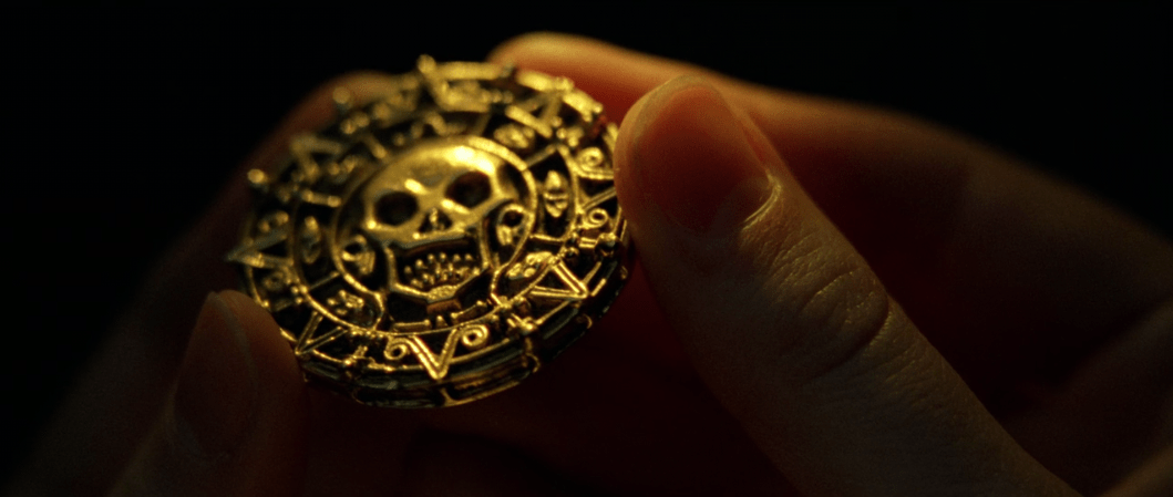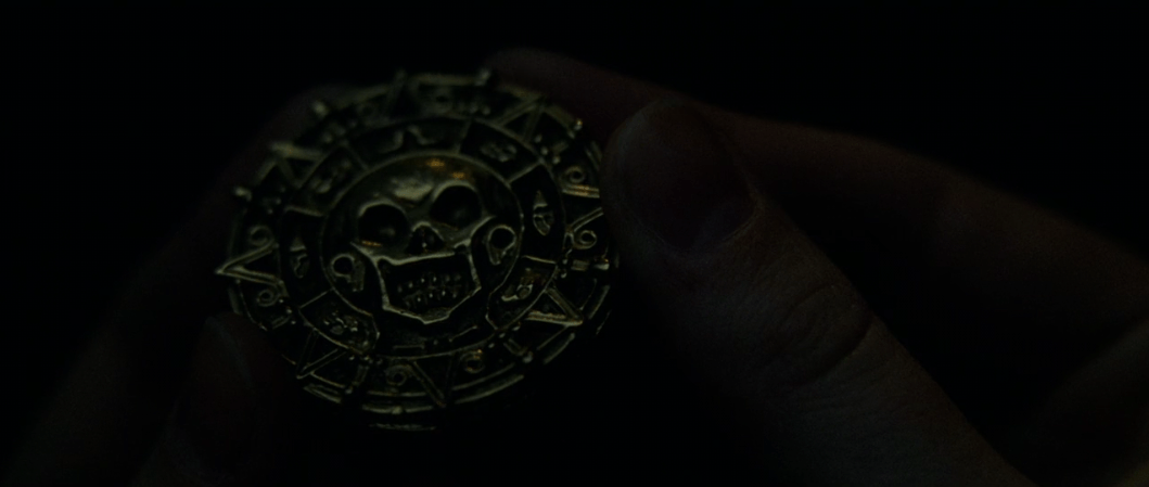 So Jack buys Gibbs a drink and convinces him to help him by telling him about Will being Bootstrap Bill’s son. Barbossa on the other hand wants to have dinner with Elizabeth back on the Black Pearl. Given some creepy coaxing from Pintel she sits down to a bountiful feast that I highly doubt they’d be able to get out on the high seas when Barbossa tells her the tale of the treasure. The medallion is actually Aztec gold given to Cortes himself after his invasion of their homeland to stop him from slaughtering the rest of their people. It’s part of a series of 882 identical pieces given to Cortes in a stone chest that was cursed by the Aztec Gods on account of Cortes’ insatiable greed. Anyone who takes even a single piece from that chest would be cursed until the end of time. When Barbossa and his crew came upon the chest they took all the gold from it until they realized the legend was true and began rounding up the treasure again to return it. Elizabeth’s medallion is the last piece of the treasure and the curse can be lifted only when all the treasure is restored and the ‘blood repaid’. Bootstrap Bill’s blood to be exact.