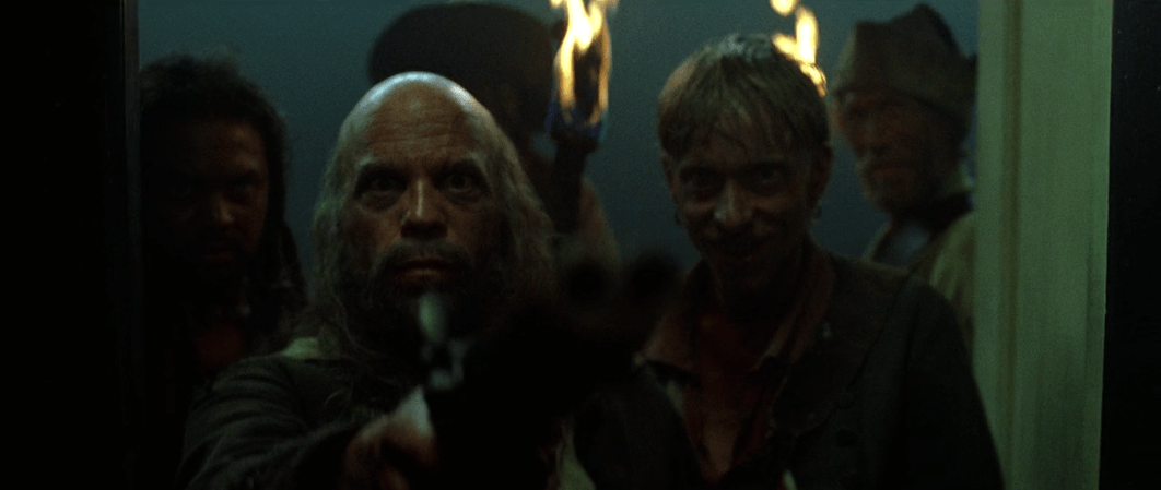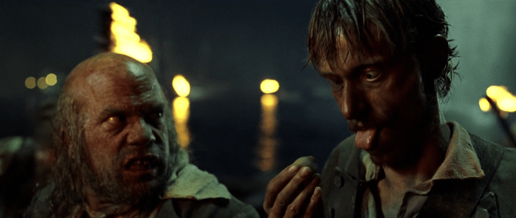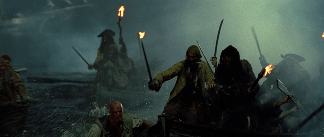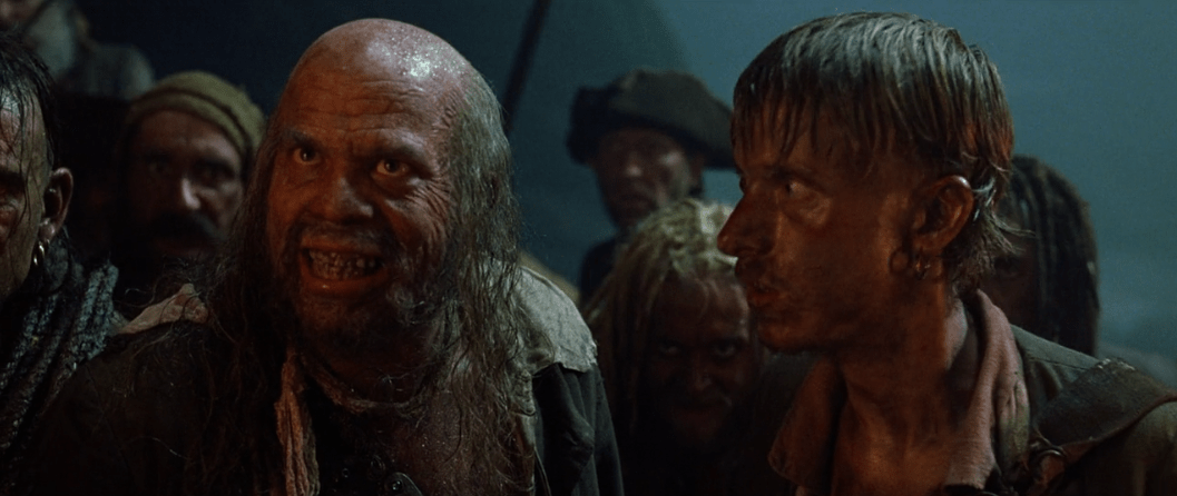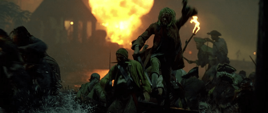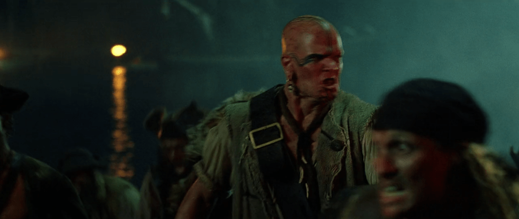 That very same night as Elizabeth is winding down in her bed and Will is toiling away at the blacksmith there’s a change in the wind. Port Royal is caught up in cannon fire from the crew of the Black Pearl! In my opinion, it’s at this point that the film starts to get much more fun. Don’t get me wrong, there were fun moments in the movie before like Jack’s escape and the sword fight with Will, but the Black Pearl crew have such a strong on-screen presence it’s hard not to enjoy them. What’s even cooler about them is that it would’ve been so easy for the filmmakers to cast extras in these roles but they didn’t. Instead they actually cast character actors and as a result each of the pirates end up having their own distinct personalities which makes them even more fun to watch.