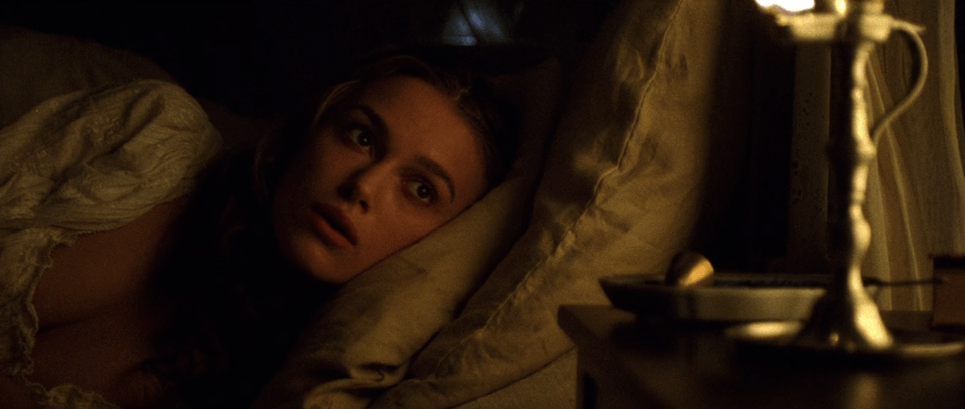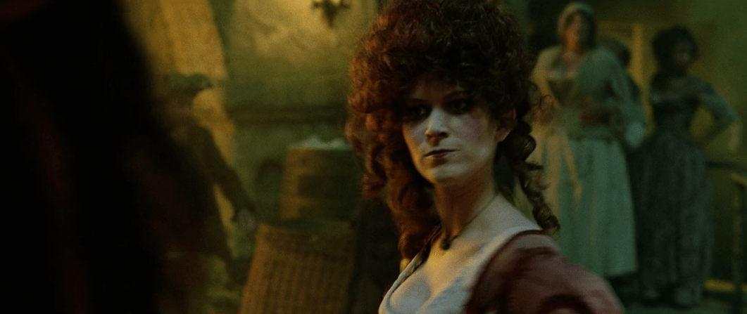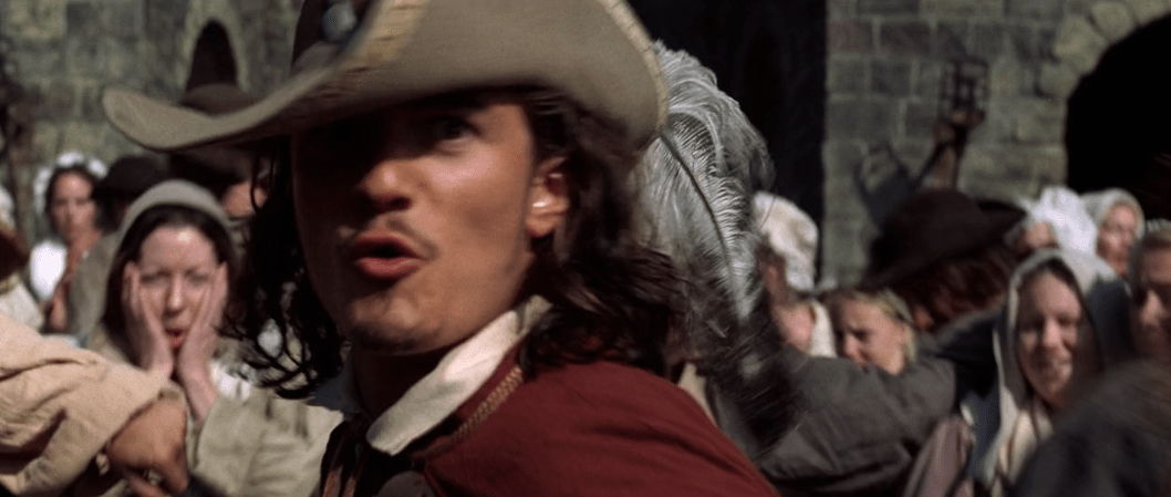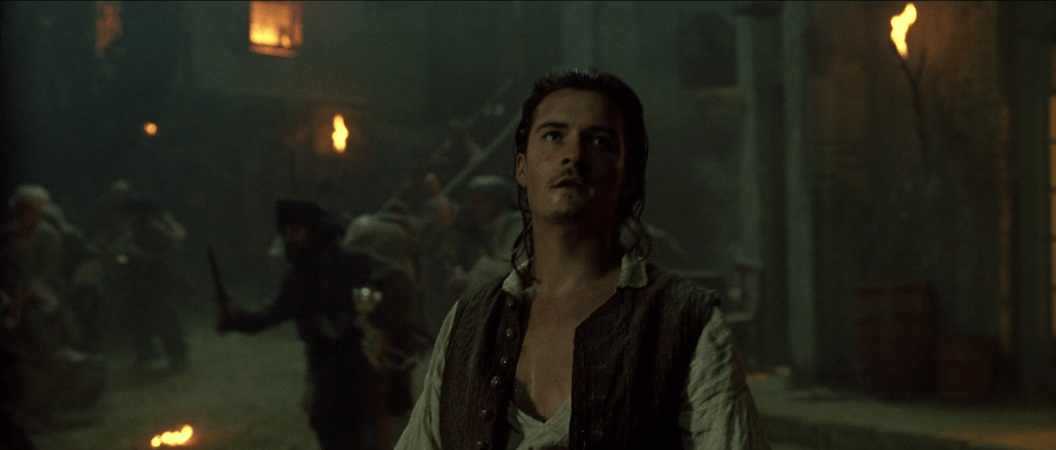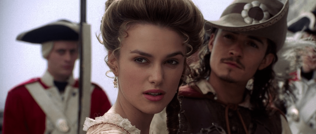 We see a now adult Elizabeth (played by Keira Knightley) waking up from a dream when her father comes in to give her a dress for Norrington’s promotion ceremony as he’s slated to become a Commodore. She…doesn’t like it. Meanwhile, grown-up Will (played by Orlando Bloom) is downstairs waiting to give Governor Swann his latest sword because he’s a blacksmith’s apprentice now. Getting back to what I was saying before, I’m really struggling to pay attention when the focus is on Will and Elizabeth. I ‘will’ (heh, get it?) give Elizabeth some credit that she can be somewhat interesting. While she’s not particularly complex or anything, she can still be quick on her feet and can get some genuine laughs. It’s obvious she’s interested in both pirates and government at the same time, being torn between two polar opposite worlds which ignites her sense of adventure and allows her to show off her cleverness on more than one occasion.