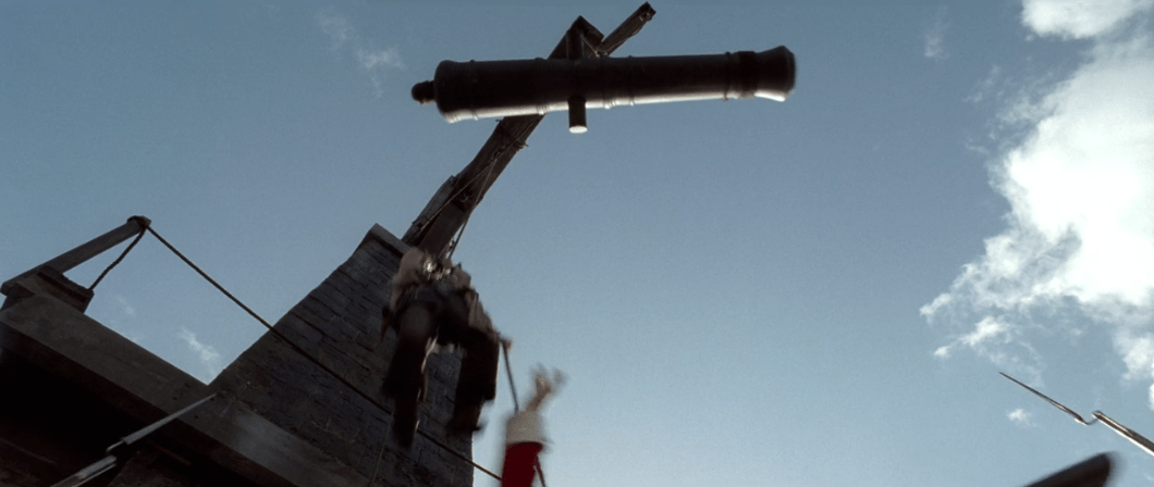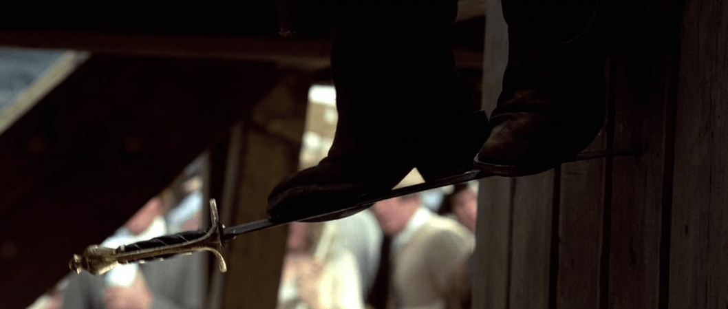 With that aside, Jack makes his way into a blacksmith’s workshop where he manages to break his bonds with a…wheel. Not really sure how that works, but okay. Unfortunately though, this blacksmith’s workshop is the same workshop Will is an apprentice at! Funny how that works. Will of course walks in to find Jack which of course results in the film’s first sword fight which is very well choreographed and has some fun physical comedy thrown in for good measure. Depp, Bloom, Rush and many other actors put a lot of effort practicing sword fighting for the sake of this film (granted Bloom already had experience from Lord of the Rings) and it definitely comes through on screen. That and you also get some more visual character beats with Jack that you may not notice upon first viewing. This is highlighted when we see Jack challenge Will’s 3 hour/day practice by putting his footwork to the test which also distracts Will enough for Jack to move himself closer to the exit. We see it again after Will disarms Jack prompting him to cheat by spraying Will with sawdust and pulling out his pistol cementing his cutthroat pirate persona. When Will refuses to step out of the way, Jack seems reluctant to shoot him though. For now we don’t know why Jack doesn’t want to use his shot, but he will use it if he has to.