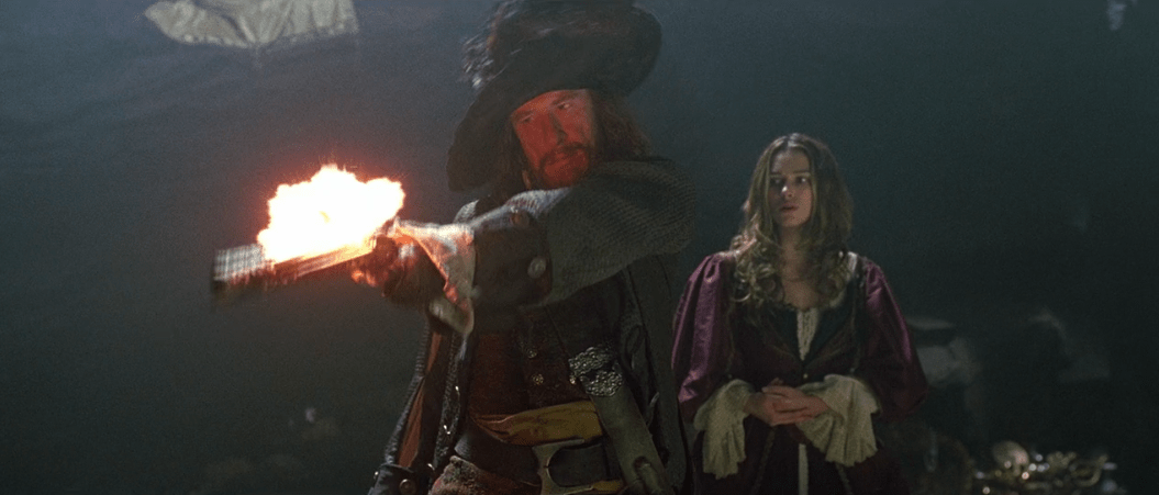 On the Black Pearl we’re officially introduced to Captain Barbossa (played by Geoffrey Rush) who’s clearly having a ball on screen and Elizabeth gets a chance to show off how smart she can be as well. When Barbossa refuses to leave Port Royal Elizabeth says she’ll drop the medallion into the water which causes him to change his tune. He asks Elizabeth her name and she says ‘Elizabeth Turner’. For the longest time I wondered why exactly she did that because it just never made sense. What makes it even muddier is when later in the film she admits even she doesn’t know why she did it, but I think I finally know why. After giving it some thought, she initially found the medallion around Will’s neck when she was a kid so she may be correctly assuming that the pirates are actually after him so she’s taking his last name to protect him. That and one of her handmaidens not that long ago told her that she was in danger by being the Governor’s daughter so she took Will’s name and pretended to be a handmaiden herself to dissuade the pirates from killing her or holding her for ransom as the Governor’s daughter. Either way, the pirates hear the name ‘Turner’ and are immediately interested. They agree to leave and never come back but take Elizabeth with them for reasons unknown to us for the time being.