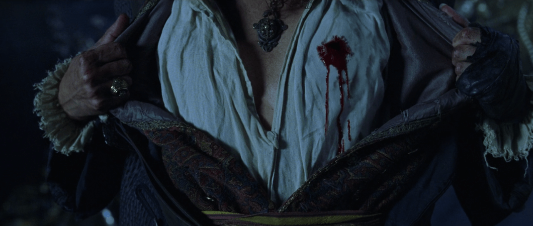 Really the majority of the climax is cutting back and forth between the fight happening on the Dauntless and the fight on Isla de Muerta in front of the stone chest. Eventually Elizabeth makes her way into Isla de Muerta after freeing the crew on the Black Pearl and she goes to help Will and Jack. After a lot of sword fighting, going back-and-forth between moonbeams, and stomach grenade-ing, Jack eventually shoots Barbossa. Wait, isn’t Barbossa still cursed? Actually no, because a few seconds ago Jack passed his medallion to Will and he only just now lifted the curse by returning both lost medallions to the chest and using his blood. It then leads to this pretty cool moment.