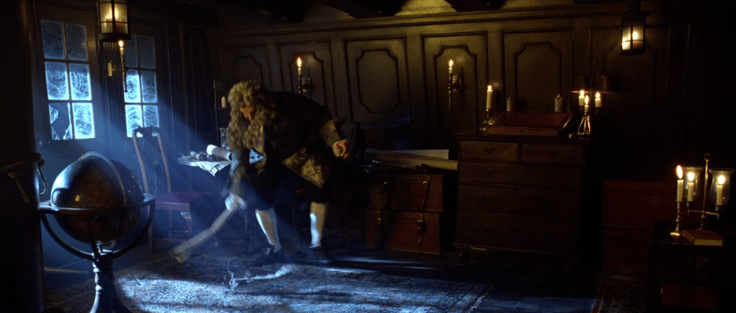 Instead she opts to hide in a hidden cupboard and make it seem like she escaped out the window when suddenly Pintel and Ragetti burst in. They’re not buying the window escape though so they try to coax Elizabeth out by explaining to her how they found the medallion. The shockwave that went through the water when Elizabeth fell in earlier is what called out to them and drew them to Port Royal. Elizabeth can’t stay hidden forever though which is revealed in this pretty cool moment: