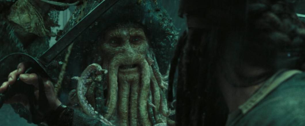 Will and Elizabeth also have Barbossa marry the two of them in the middle of battle because remember: we hanged a kid at the beginning of this movie! Uh-oh, but Will gets stabbed by Davy Jones! Oh, the heartbreak! Funny thing is that Jack managed to get the key from Jones before this happened, opened the chest, and threatened to stab Jones’ heart right before Jones stabbed Will.