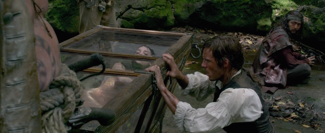 Back with the crew, the case they’re carrying the mermaid in breaks and we see that when mermaids go on land they turn human. This had to be a first draft for Luca, right? Also, the missionary takes this as an opportunity to grow even more fond of the mermaid by carrying her in his arms since she has trouble walking and naming her Syrena. Okay, I’ll concede some ground. Angelica and Jack aren’t one of the greatest couples of all time, it’s missionary boy and Syrena! People will be talking about their undying love for centuries to come!