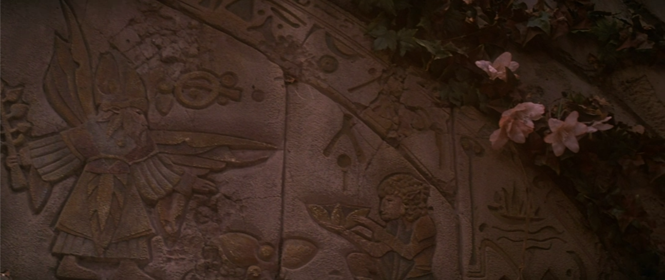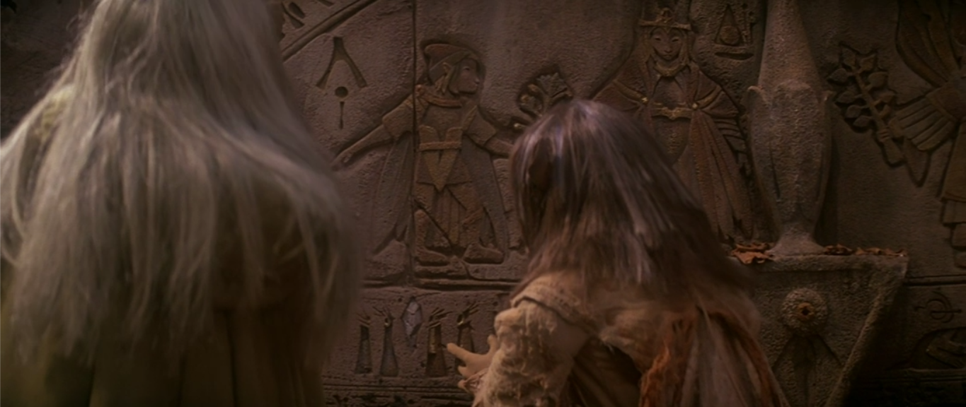 They get up to see a shrine close by them with writing on it while Jen completely ignores the shard he threw the night before (pick it up!). Written on the shrine is the prophecy explaining how the Skeksis will fall by Gelfling hands, and I think now is a good time to mention that the Skeksis were originally going to have their own language too. It was going to be a combination of ancient Greek and ancient Egyptian which you can see in the writing on the shrine, but the test audiences complained that they didn’t know what the Skeksis are saying.