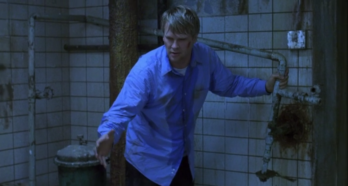 Since Adam and Lawrence are chained to pipes on opposite ends of the room they have to throw clues to each other to figure things out. This takes up a not insignificant portion of this movie. Eventually Adam manages to grab the tape player from the dead man’s hand and play the tape he found. Thus, the world heard the Jigsaw killer’s voice for the first time.